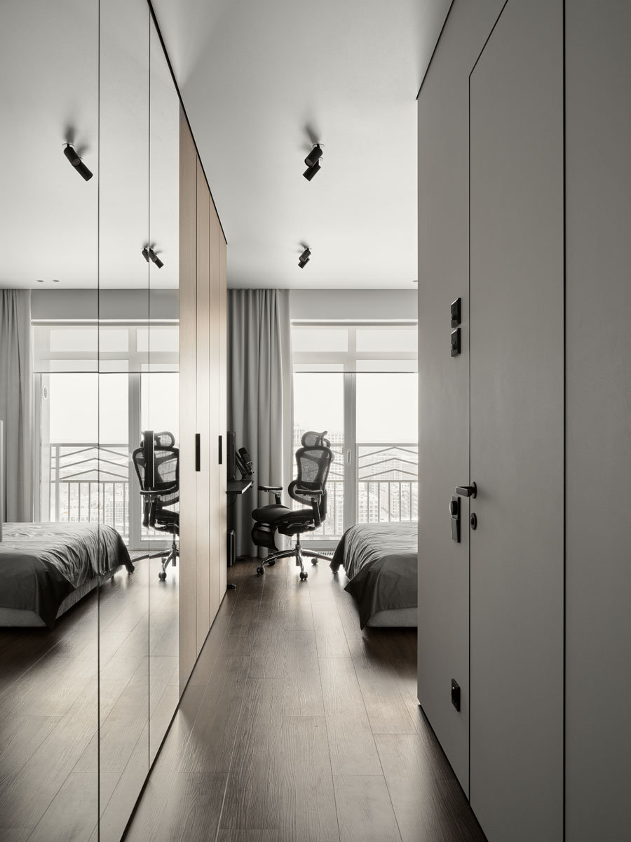 За внешним минимализмом и аккуратными стыками скрывается современная начинка: элементы умного дома, электрокарнизы, тёплый пол.